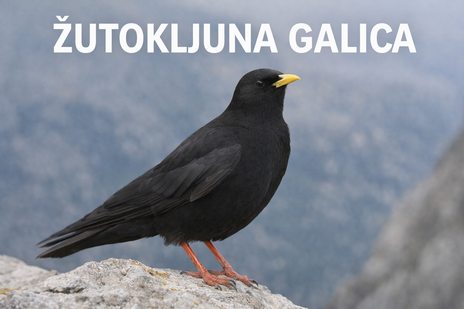 Žutokljuna galica je karizmatična planinska ptica s crnim perjem i žutim kljunom, savršeno prilagođena životu u surovim alpskim uvjetima.